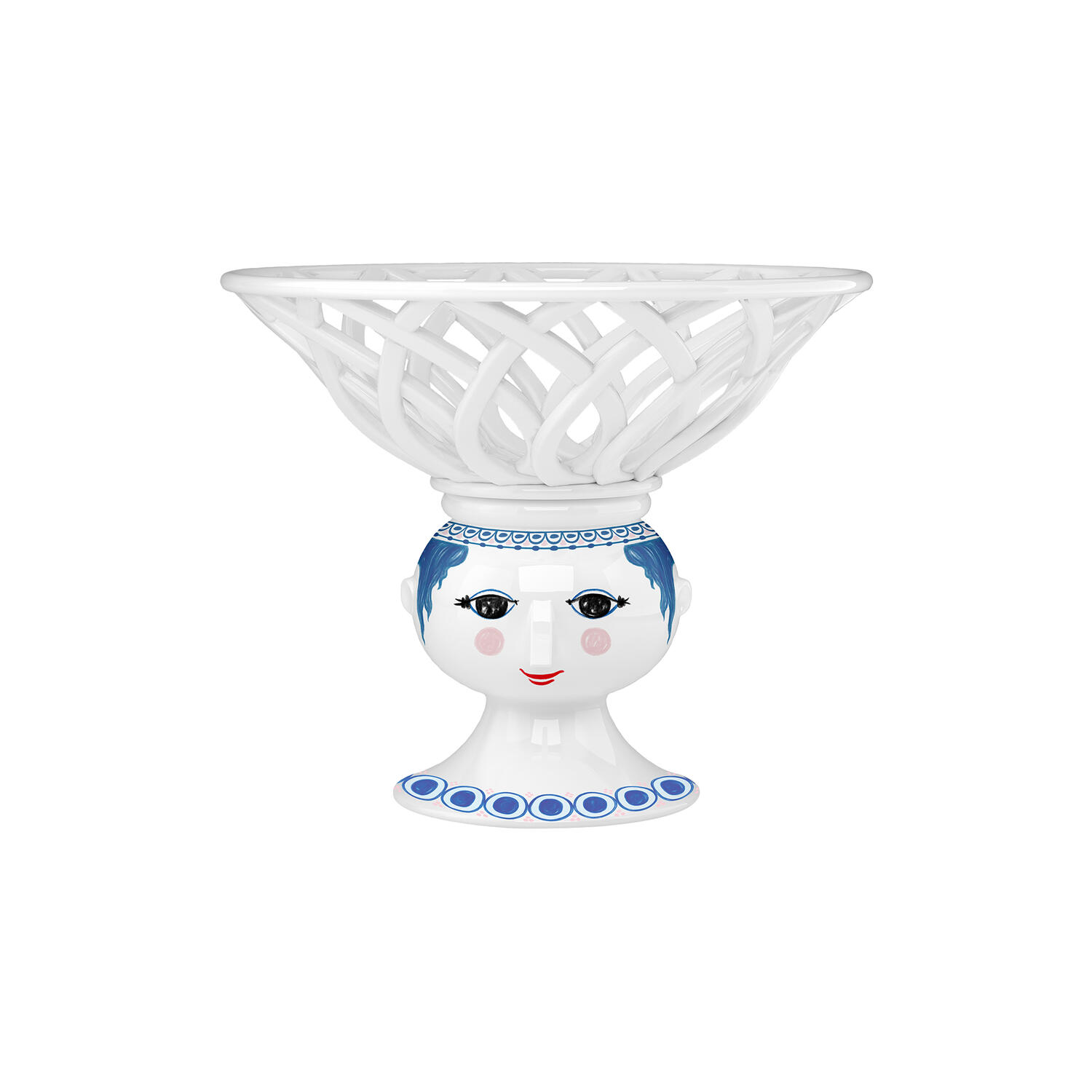 Bjørn Wiinblads Dora-frugtskål bringer hans legende univers til live i hjemmet. Skålen på 25 cm i diameter er udført i blankglaseret keramik og kombinerer funktion med kunstnerisk finesse. De flettede former, Doras ikoniske mandelformede øjne, trekantede næse, blussende kinder og fine detaljer som rose og hårbånd giver skålen liv og personlighed.