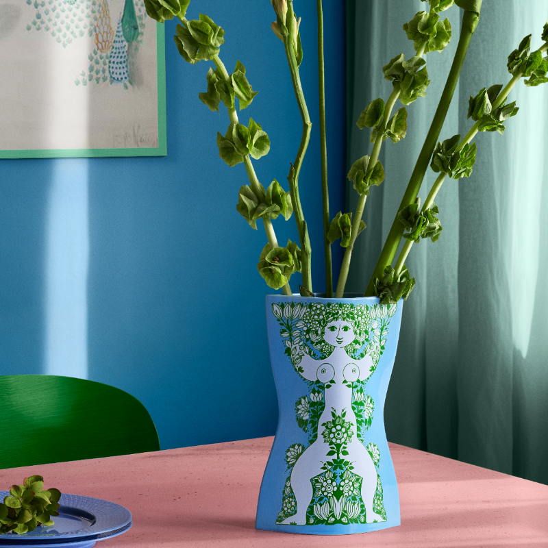 Nina-vasen fra Bjørn Wiinblad er et modigt og poetisk kunstværk på 28,5 cm, der bringer kvindefiguren og fantasifuld dekoration ind i hjemmet. Inspireret af Wiinblads ikoniske designarkiv fortolker vasen en grafisk og skulpturel kvindefigur, hvor den lyseblå grundfarve kontrasteres smukt af grønne, blomstrende detaljer i ophøjede decals, som skaber både visuel og taktil dybde.