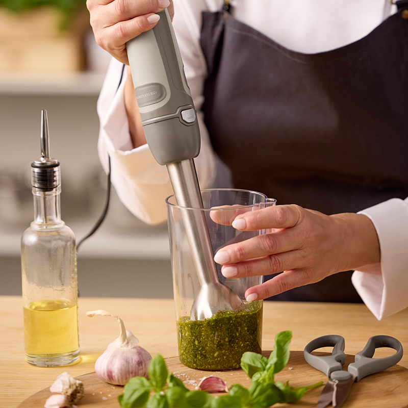 Derudover får du et 600 ml målebæger, som både kan bruges til præcis opmåling og til at blende eller mikse mindre portioner direkte i bægeret – ideelt til smoothies, dressinger, supper og babymad.