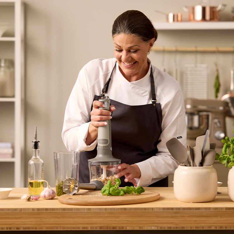 Sættet indeholder praktisk tilbehør, der gør madlavningen mere effektiv. Den medfølgende 500 ml minihakker håndterer hurtigt nødder, krydderurter, løg og grøntsager, så du sparer tid på forberedelsen.