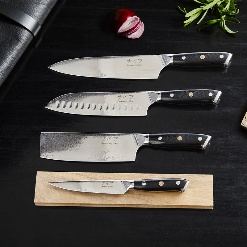 Med en hårdhed på 59–60 HRC ligger knivene markant over mange standard køkkenknive og sikrer en skæreevne, der holder længere.