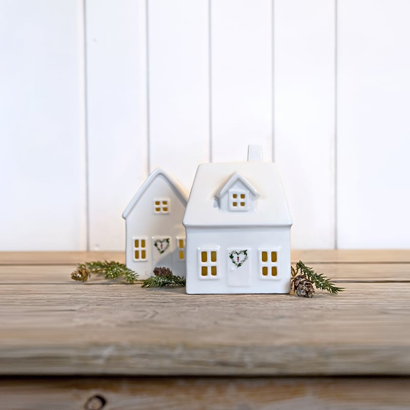 Lad disse to små, fortryllende porcelænshuse fra Det Gamle Apotek bringe varme og lys ind i dit hjem med deres blide LED-skær. De fine udskårne detaljer – som vinduer, døre og et hjerte omkranset af gran – skaber en magisk stemning, der er perfekt til at fylde de mørke vinteraftener med hygge. Hvert hus er omhyggeligt fremstillet i porcelæn, og de udskårne elementer tillader et varmt, indbydende lys at skinne igennem, hvilket giver en følelse af ro og julehygge.
