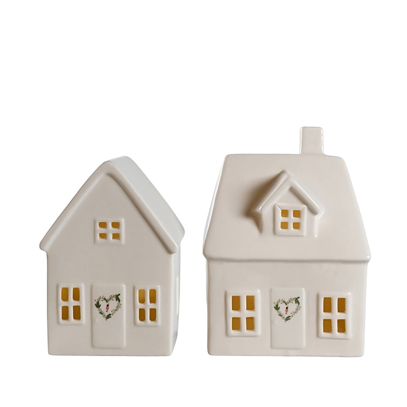 Placer dem på en hylde, i vindueskarmen eller på et sidebord, og lad deres enkle elegance tilføre et strejf af eventyr og charme til din boligindretning. Mens disse porcelænshuse er ideelle til at skabe den perfekte julestemning, er de også smukke nok til at være fremme året rundt. De to forskellige størrelser komplementerer hinanden og giver en dynamisk og harmonisk effekt.