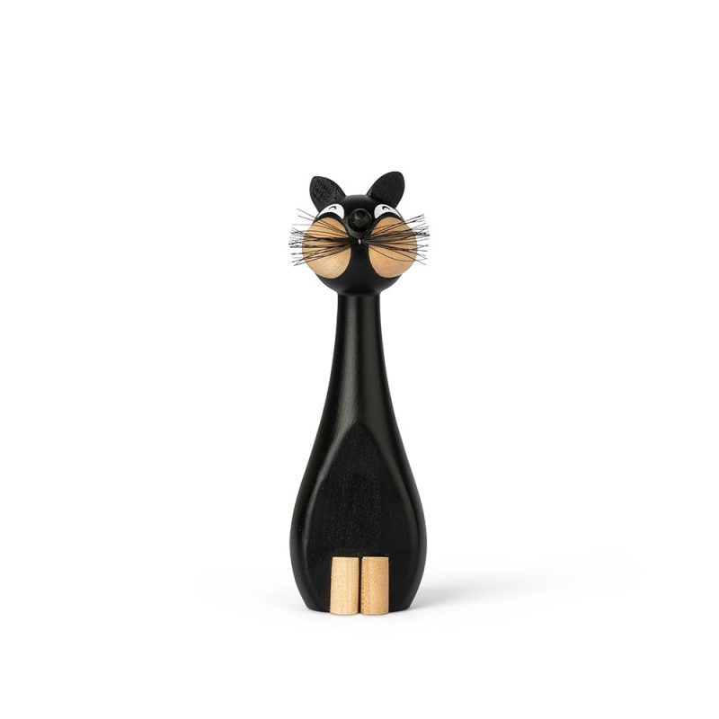 Katten er forarbejdet i malet sort træ med kinder og poter af ahorn. Katten måler 15,7 cm. i højden.