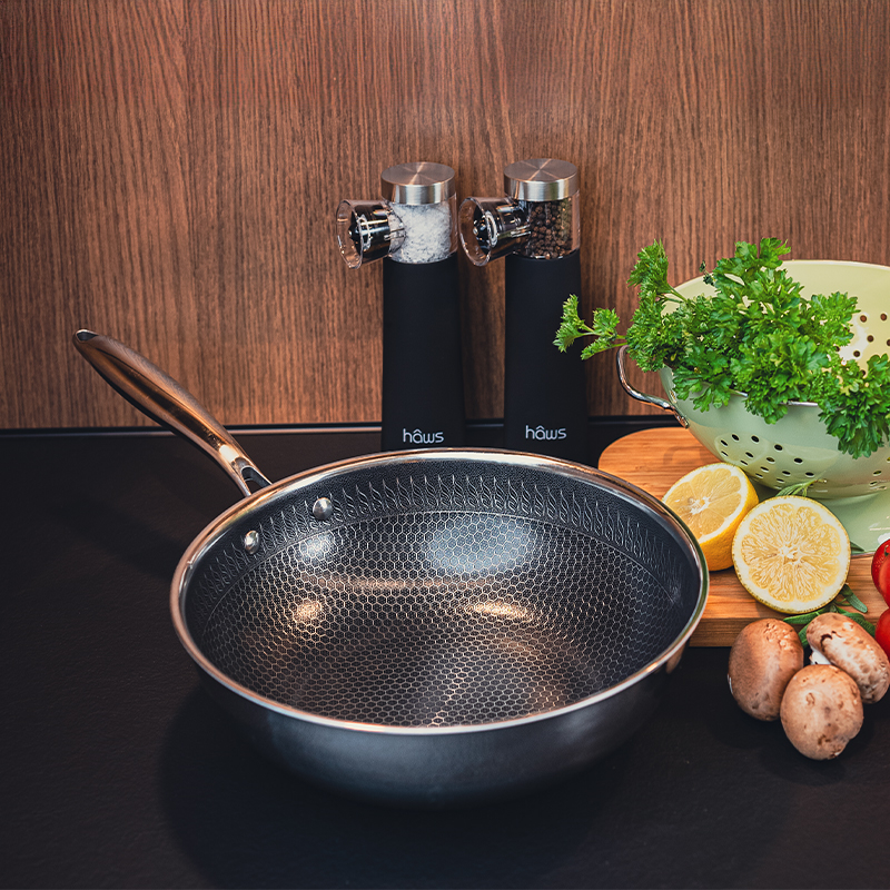 Haws Santo Wokken er fremstillet i rustfrit stål af høj kvalitet med en innovativ 3-lags multi-ply teknologi.