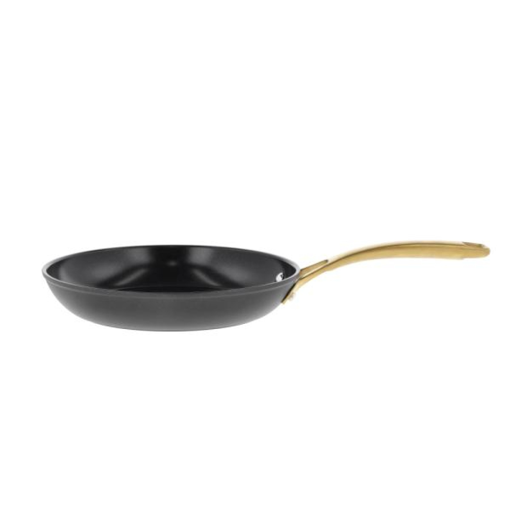 Den smart Brasserie-serie er fremstillet i praktisk aluminium. Panderne har keramisk belægning indvendigt, samt en sort coating udenpå og en elegant mat messingfarvede greb og håndtag.