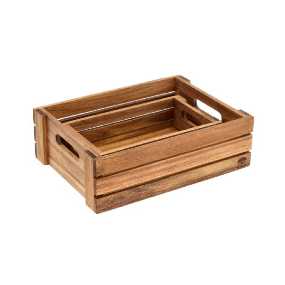 De elegante trækasser i to størrelser er perfekte til alsidig opbevaring, hvad enten det er olier, krydderier og krydderurter i køkkenet, eller til køkkenredskaber og servietter.