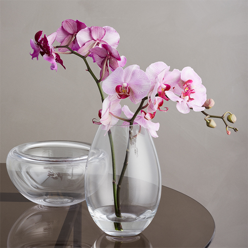 Det klare glas gør det muligt for blomsterne at træde tydeligt frem og fremhæver både farver og former, uanset om du vælger en fyldig buket eller enkelte stilke. Samtidig fungerer vasen som et selvstændigt dekorativt objekt, der tilfører lys og luft til indretningen, selv uden blomster.
