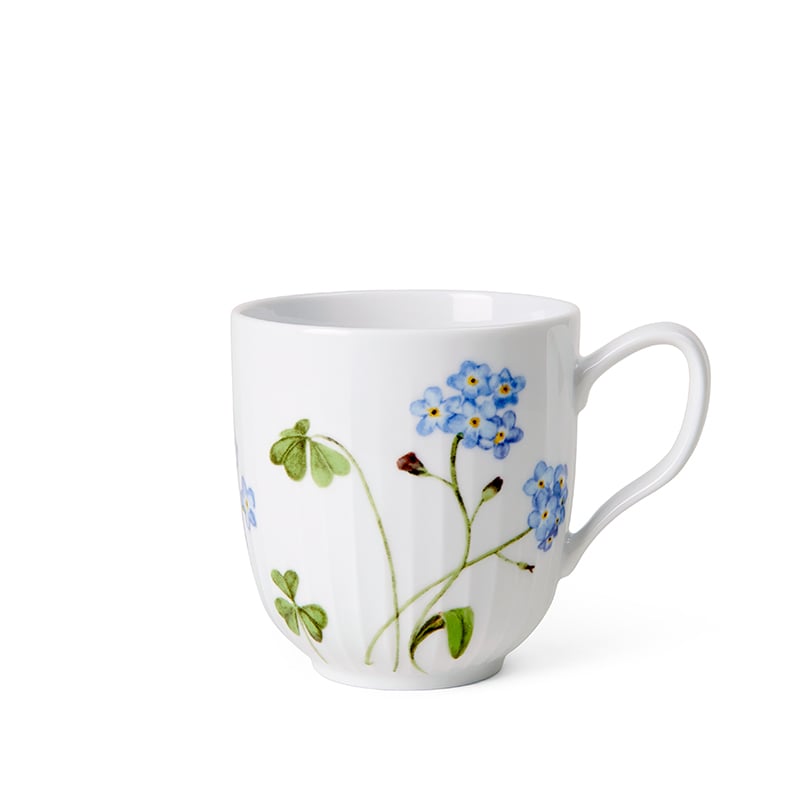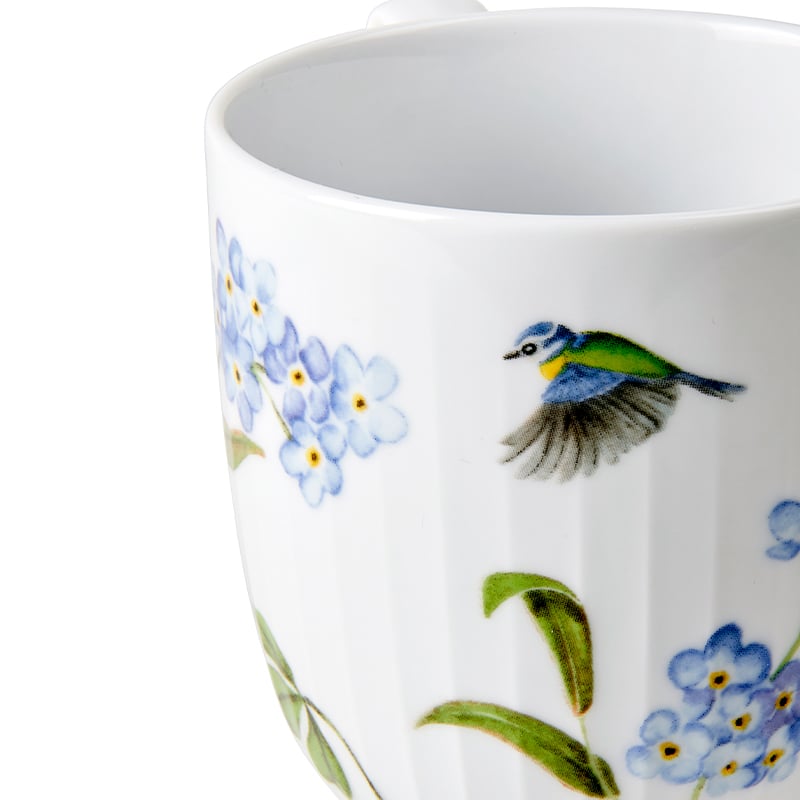 Dette smukke krus prydes af den delikate forglemmigej og en elegant blåmejse, der sammen med de karakteristiske riller skaber et udtryk, der både er klassisk og sommerligt. Brug det til en kop te i morgensolen eller til kaffe med gæster på terrassen.
