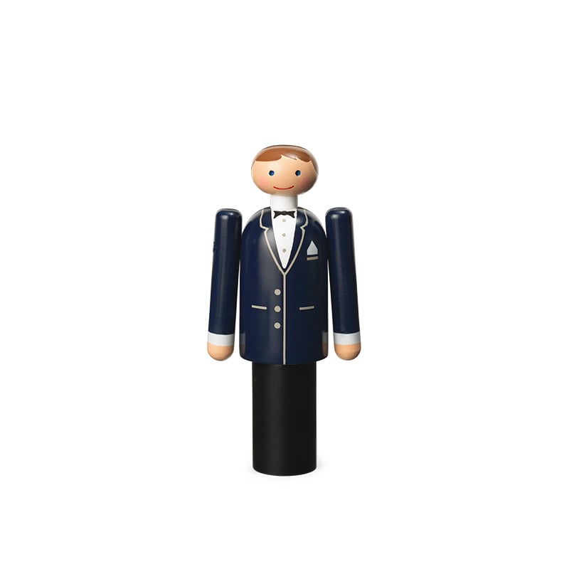 Brudgommens klassiske look er tro mod Kay Bojesens oprindelige design. Han er iklædt mørkt jakkesæt med hvid skjorte og sort butterfly og detaljer som lommeklud, knapper og revers er malet med stor nøjagtighed. Med sit venlige smil og elegante fremtoning oser han af personlighed. Figuren måler 12 cm og sælges enkeltvis.