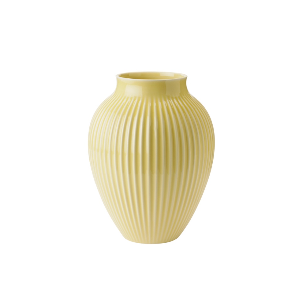 En elegant Kanbstrup-vase i gul. Den fine Knabstrup-vase har karakteristiske riller. Lad vasen stå alene eller miks og match med de øvrige elementer fra Knabstrup-serien for at skabe en unik og harmonisk designoplevelse.
