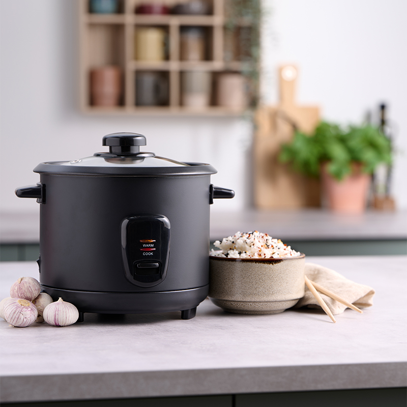 Denne kompakte riskoger på 1 liter kombinerer funktionalitet og stil i ét elegant, sort design.