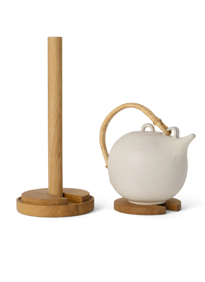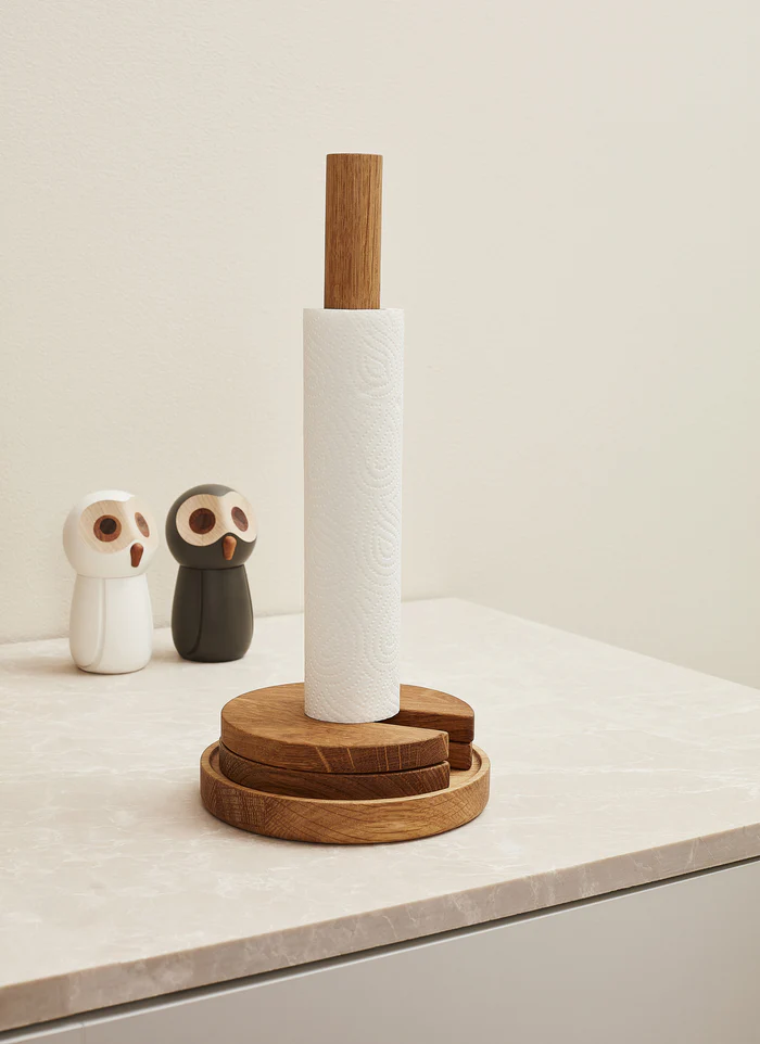 Stack er udført i smukt egetræ, hvor bordskånerne elegant hviler omkring køkkenrulleholderen. De er lette at tage af og sætte på igen, hvilket gør løsningen både praktisk og stilfuld. Konstruktionen føles solid, men er samtidig let at flytte efter behov – og fordi Stack kombinerer to funktioner i én, har du altid en hånd fri i køkkenet.