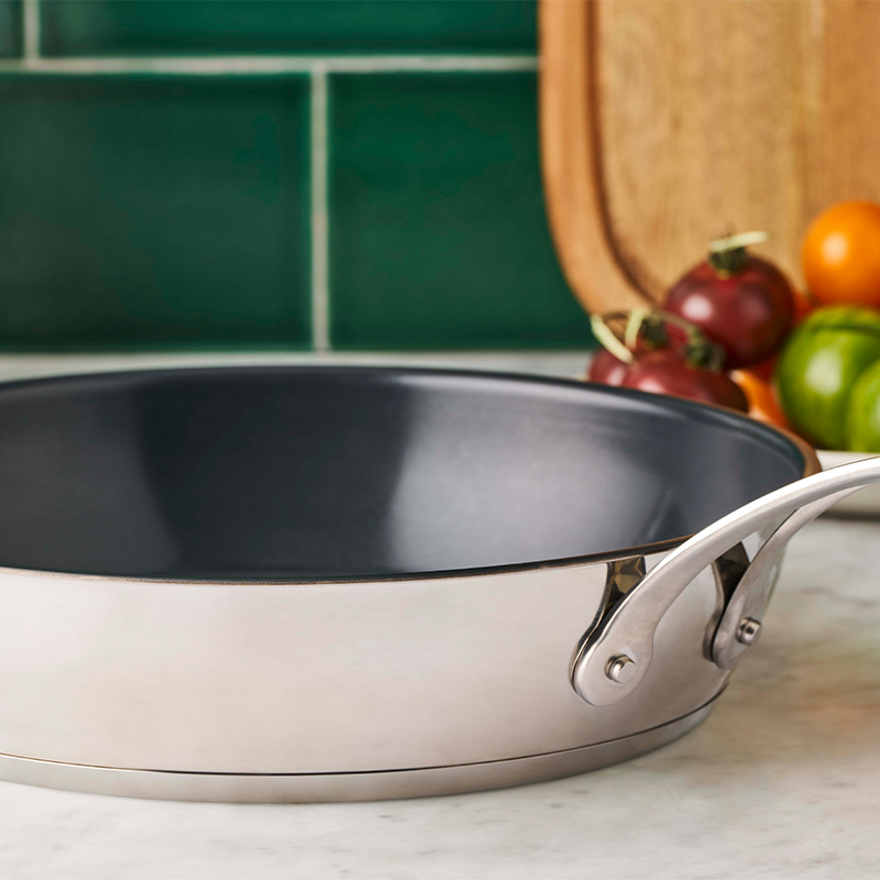 Stegepanden er fremstillet i robust rustfrit stål, hvoraf 90 procent er genanvendt materiale. Den keramiske non-stick belægning har en glat overflade, som forhindrer maden i at hænge fast og gør rengøringen hurtig og enkel. Belægningen er samtidig PFAS fri.