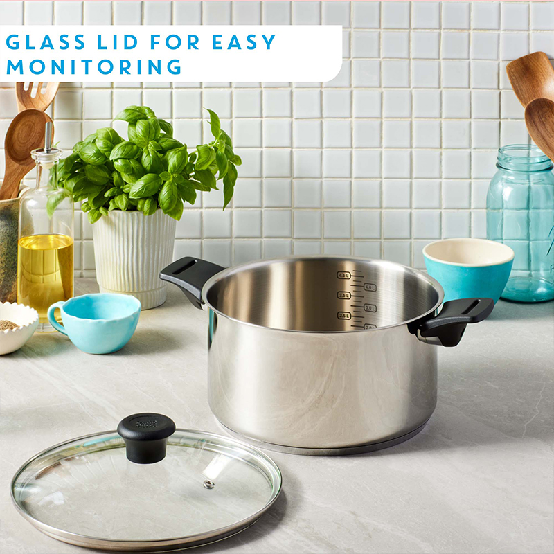 Gryderne er fremstillet af holdbart 18/10 rustfrit stål med praktisk måleskala, glaslåg med dampventil og ergonomiske håndtag.